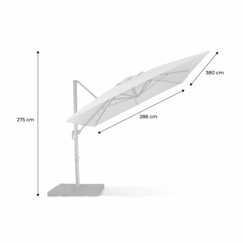 Toile de 380x286cmRotation de 360 °Inclinable dans 6 positions.Toile de 240 gr/m2 env. avec aération au sommetL’armature et les 8 baleines sont en aluminiumDimensions du mât : 77x53mmEpaisseur du mât : 2mmHauteur du parasol :259cm (210cm au point le plus bas quand il est ouvert)Poids :22kg