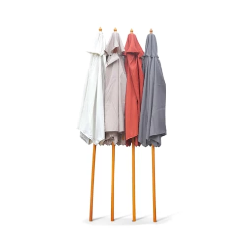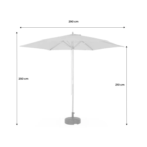 La structure du parasol Cabourg est en bois. La toile est en polyester enduit d’un produit hydrofuge. Cela la rend déperlante. Le mât s’insère dans n’importe quel pied de parasol compatible avec les mâts de 38mm de diamètre.