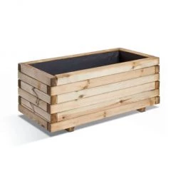 Cette jardinière possède un design épuré par superpositions de lamelles de bois. Elle est constituée de lamelles de pin européen assemblés par des clous.