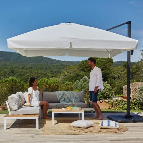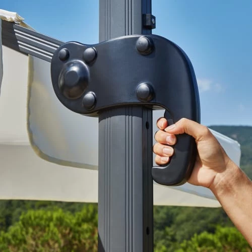 Il peut être tourné à 360 degrés pour choisir l’orientation la plus pratique et possède une manivelle qui permet d’ouvrir et de fermer le parasol très simplement.