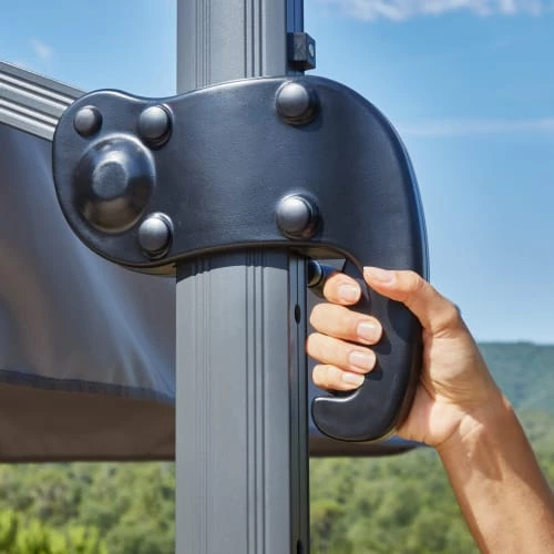 Il peut être tourné à 360 degrés pour choisir l’orientation la plus pratique et possède une manivelle qui permet d’ouvrir et de fermer le parasol très simplement.