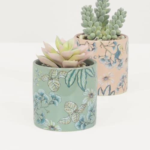 Craquez pour cet ensemble de 2 succulentes artificielles et leurs pots aux motifs floraux et bestiaires.
