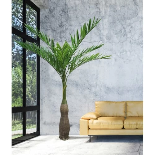 Grâce à son tronc bouteille parfaitement imité et ses palmes au toucher naturel, ce palmier artificiel deviendra vite la pièce maîtresse de votre décoration.