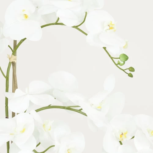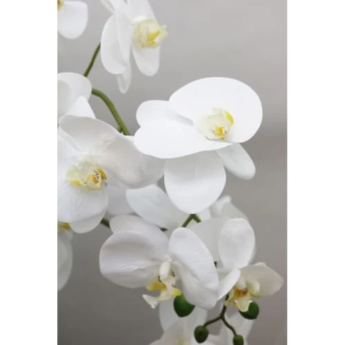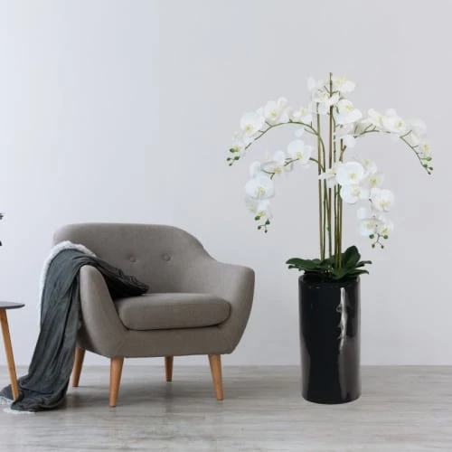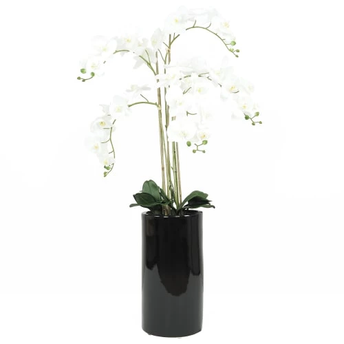 Cette magnifique orchidée artificielle est majestueuse, par sa taille 135 cm, ses 5 branches florales et ses fleurs au « toucher naturel » Son pot en céramique noir brillant la sublime.