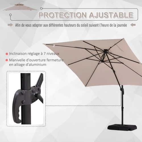 – Possibilité également de faire pivoter le parasol suivant la zone que vous souhaitez ombrager