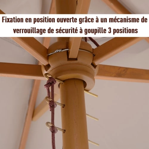 – Parasol disposant également d’une cheminée pour éviter les prises au vent et pour limiter la stagnation de l’air sous la toile