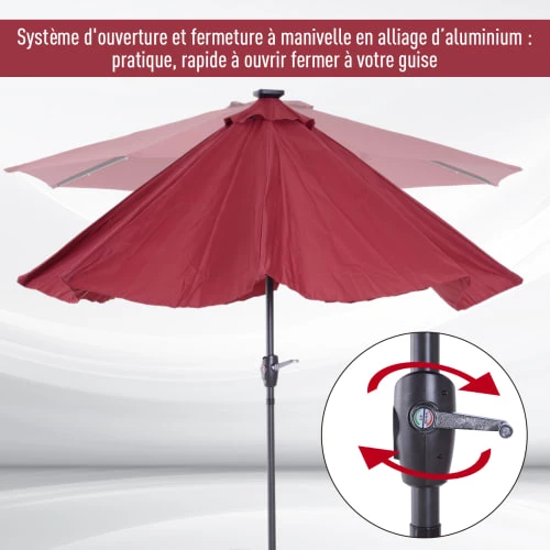 – Recommandation d’usage : il est fortement déconseillé de ne pas laisser votre parasol à l’extérieur par mauvais temps (pluie, vent, neige ou grêle)